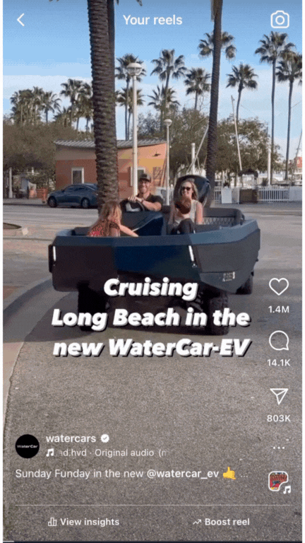 With organic content, we took WaterCar from 0 to 500,000 followers. A combined 100 million views with features on Mr. Beast, Jay Leno’s garage and The Bachelor.